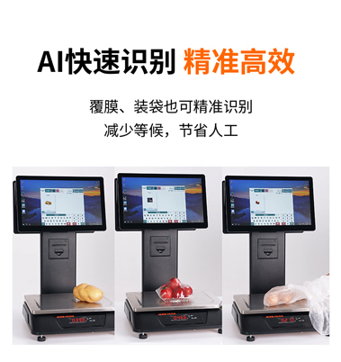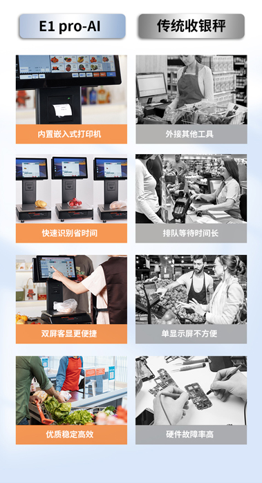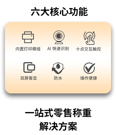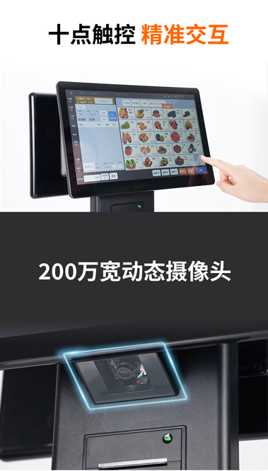 AURORA E1 PRO-AI AI收銀秤 200萬寬動(dòng)態(tài)攝像頭,AI快識(shí),智能收銀 15.6英寸十點(diǎn)觸控屏幕,雙屏客顯 內(nèi)置打印模組,簡潔高效 防水設(shè)計(jì) 使用更放心 更多