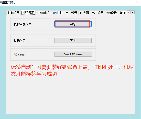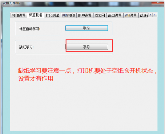 c.切換到【標簽校準】界面,選擇【缺紙學習】,點擊【學習】,打印機會正常保持3聲—提示缺紙;