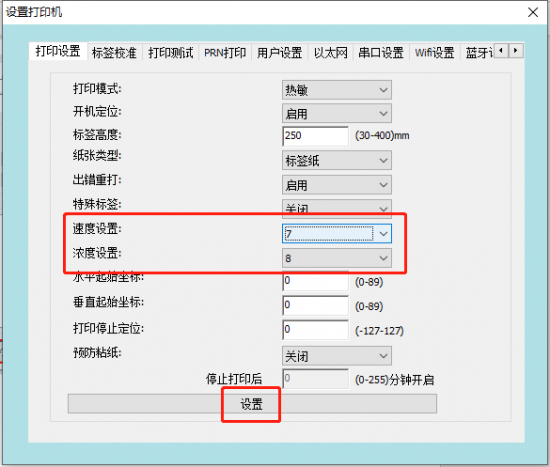 b.切換到【打印設置】界面,在速度設置/濃度設置選項中分別下拉選擇所需調(diào)整的速度和濃度,然后點擊界面最下方的“設置”項,提示【設置成功】或打印機蜂鳴1聲則表示更改設置成功。
