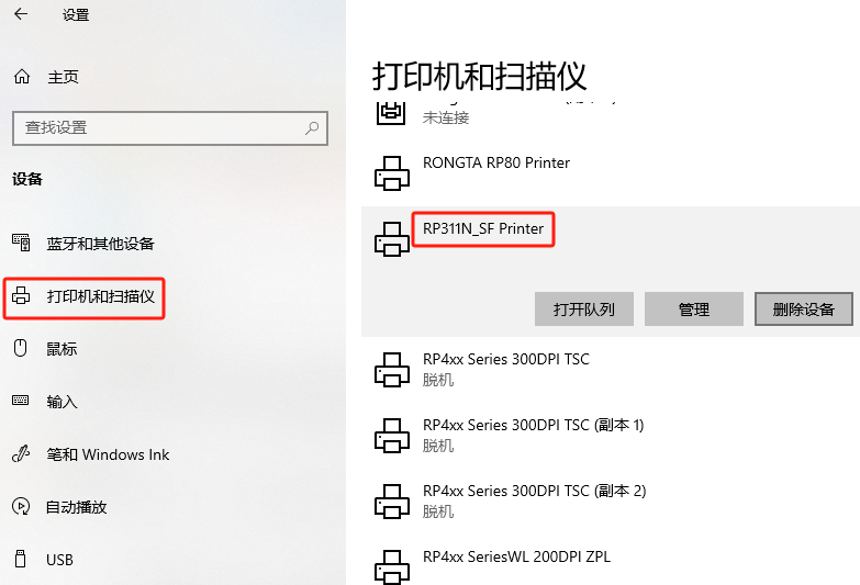 c.驅(qū)動安裝完成后可在電腦左下角Windows鍵點進去→設置→設備→打印機和掃描儀,查看是否識別出“RP311N_SF Printer”的打印機名稱,如有顯示則在打印軟件上選擇此打印機進行打印,如未顯示可重啟電腦后再查看。