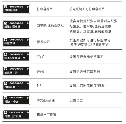 短按【電源鍵】喚醒打印機→ 長按【設置鍵】3S 進入設置界面 → 短按【設置鍵】進行選擇 → 切換對應的菜單界面,并配合【電源鍵】、【走紙鍵】進行切換和確認;
