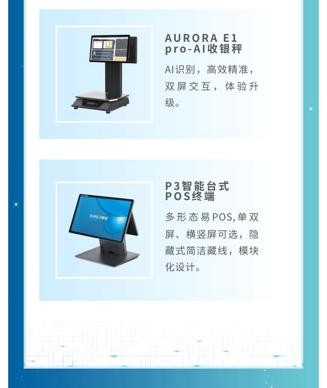 AURORA E1 PRO-AI AI收銀秤 200萬寬動態(tài)攝像頭,AI快識,智能收銀 15.6英寸十點觸控屏幕,雙屏客顯 內(nèi)置打印模組,簡潔高效 防水設(shè)計 使用更放心 更多